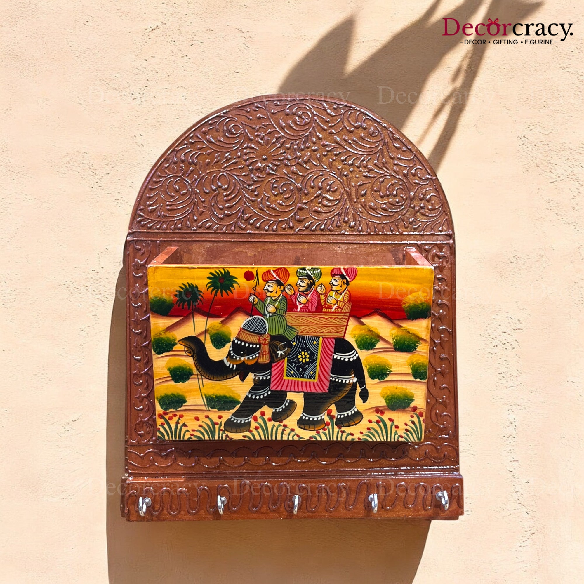 5 Hook Hanging Key Holder Triple Letter Holder Hand Painted Wooden Rajasthani Art