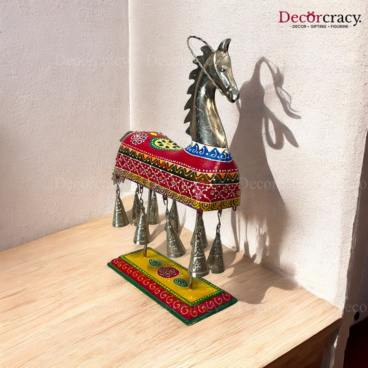 Horse with Bells Windchime Wooden Iron Showpiece Vintage Tribal Art TV Unit Décor Tabletop