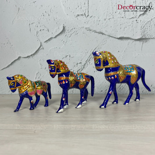Horse 3Pc Metal Meenakari Art Hand Painted Animal Set Blue/Multi