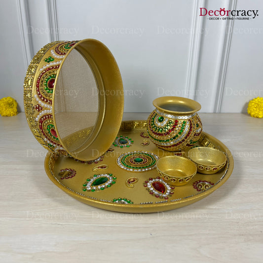 Golden Stone Karwa Chout Chot Pooja Karwa Lota Kalash Diya Channi Thali Steel Set 12"