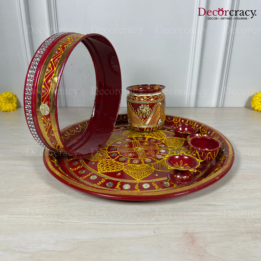 Red Karwa Chout Chot Pooja Karwa Lota Kalash Diya Channi Thali Steel Set 12"