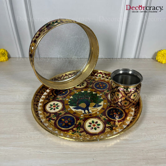 Golden Karwa Chout Full Meenakari Chot Pooja Karwa Lota Kalash Diya Channi Thali Steel Set 12"