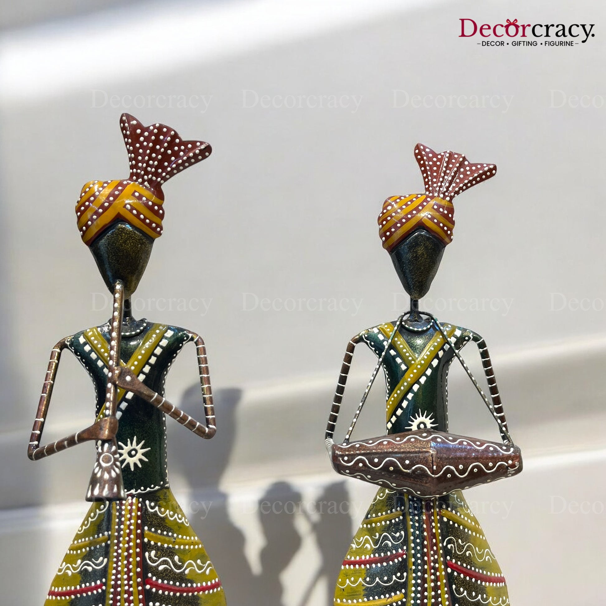 These baarat musician showpieces are crafted from iron and hand-painted in vibrant colors, reflecting the rich tribal art of Rajasthan. Each piece features a musician playing a different musical instrument. Ideal for decorating your TV unit or tabletop, these showpieces are non-religious and perfect for housewarming, homecoming, or inauguration gifts.