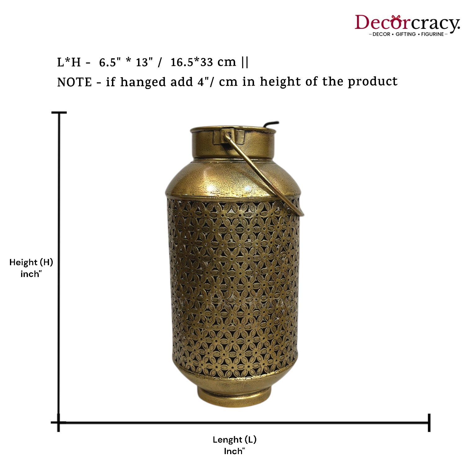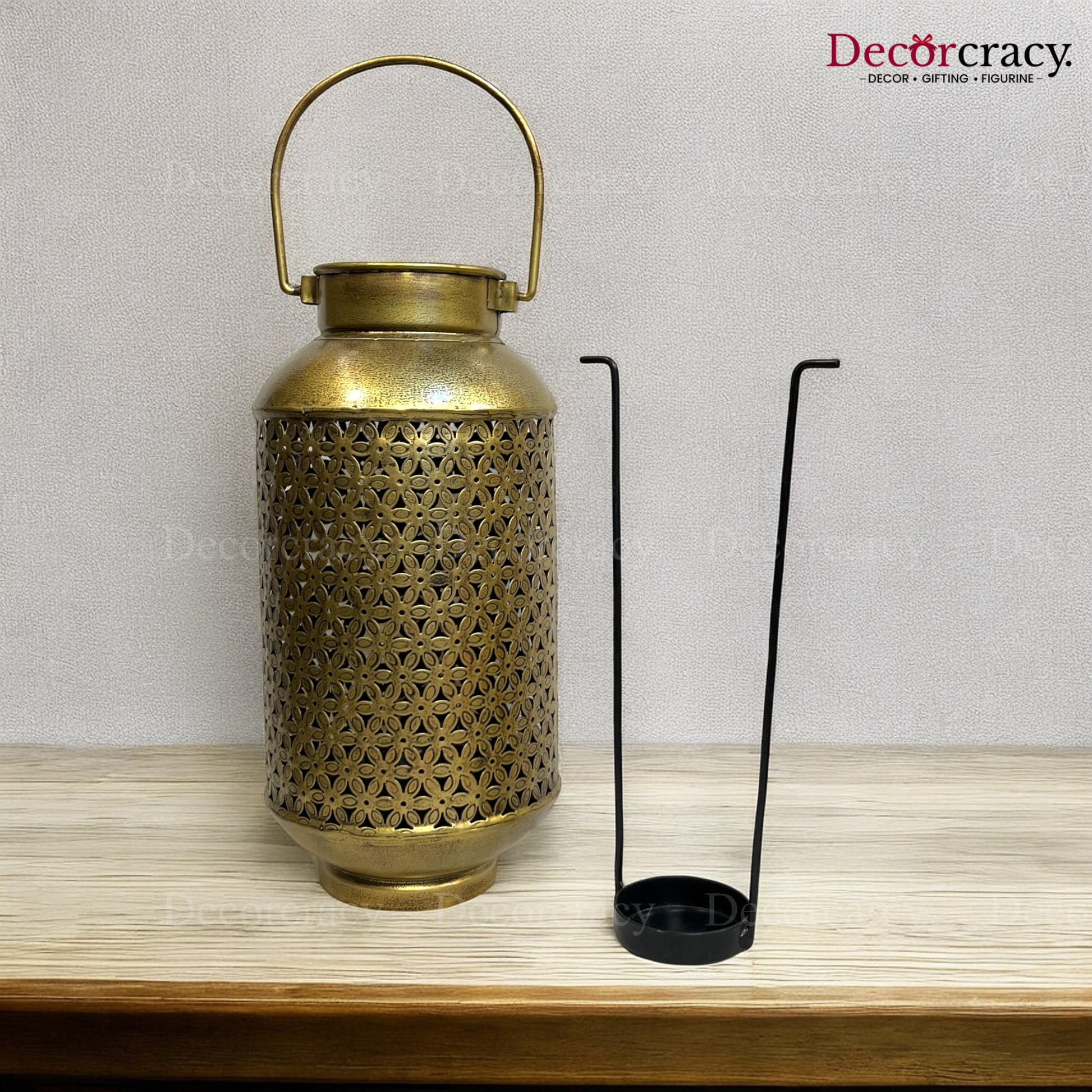 This tealight candle holder pot features a unique tribal design, crafted from durable iron with a golden antique finish. Its versatile structure allows for both hanging or placement on a flat surface, perfect for adding ambiance to your home.