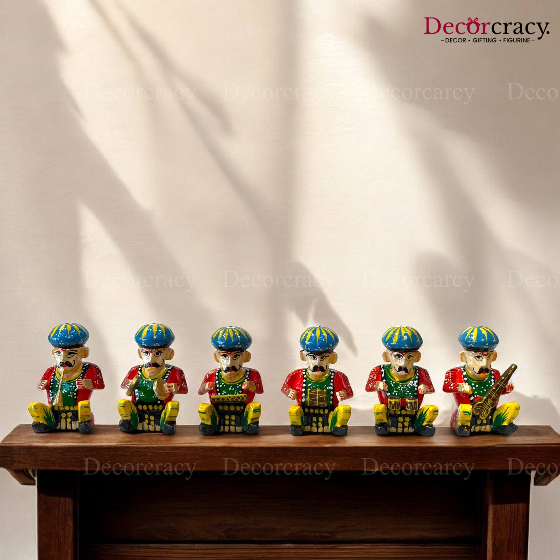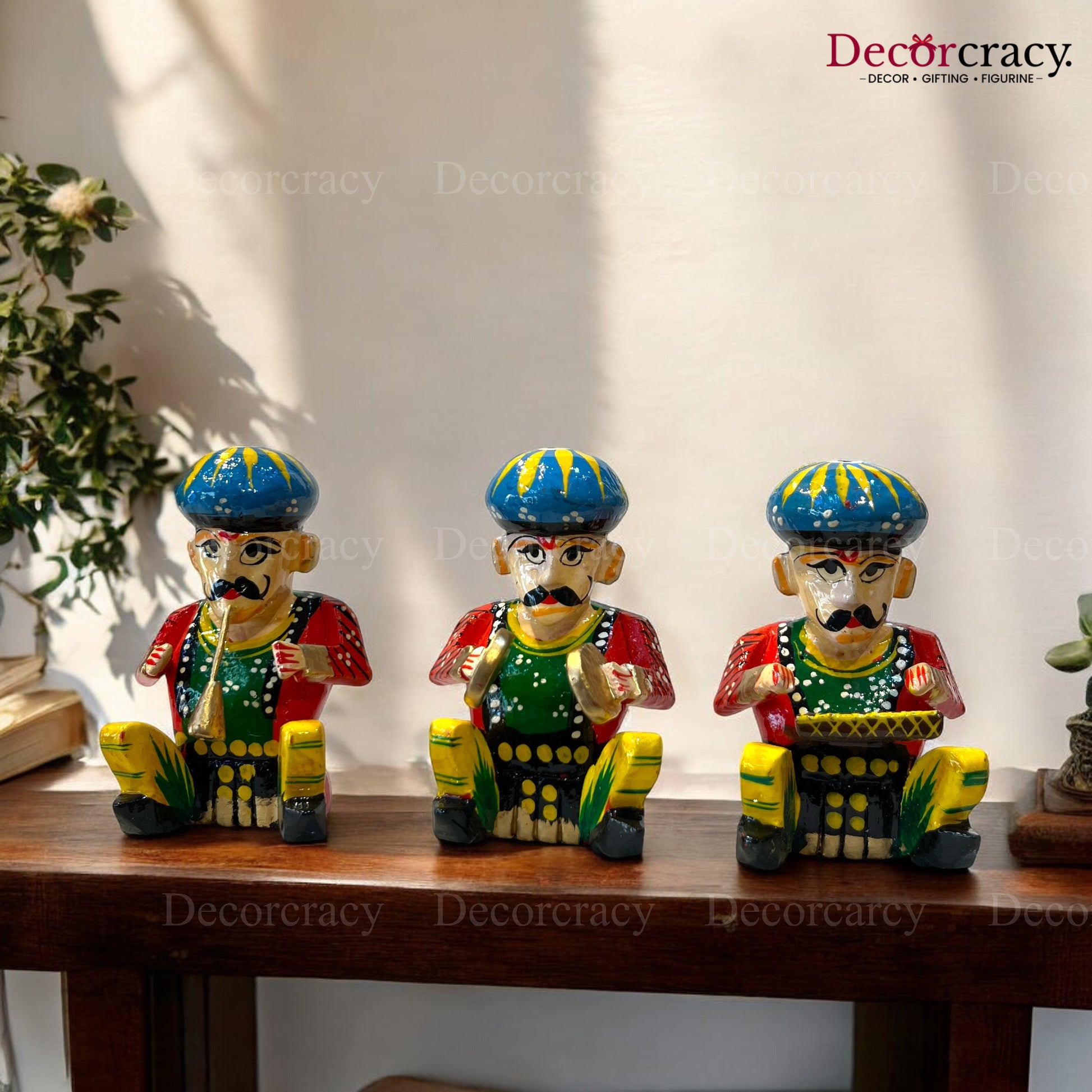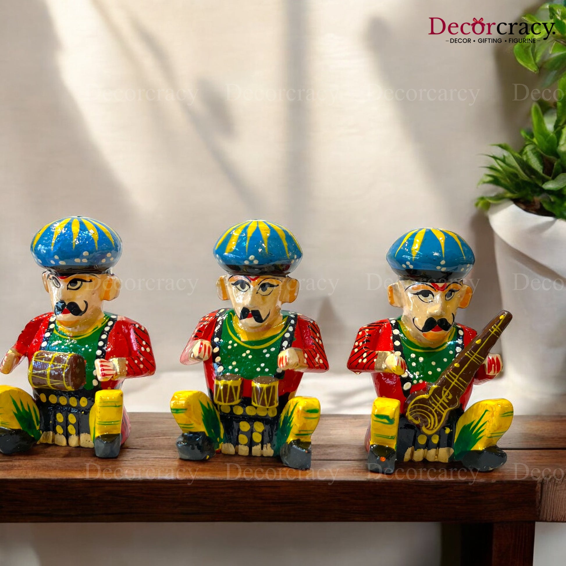 This set of hand-painted wooden Rajasthani musician bawla instruments is crafted from wood and painted in vibrant colors, reflecting the rich traditional art of Rajasthan. Their unique design and functionality make them standout decorative pieces for your home. Perfect for housewarming, homecoming, or inauguration gifts.