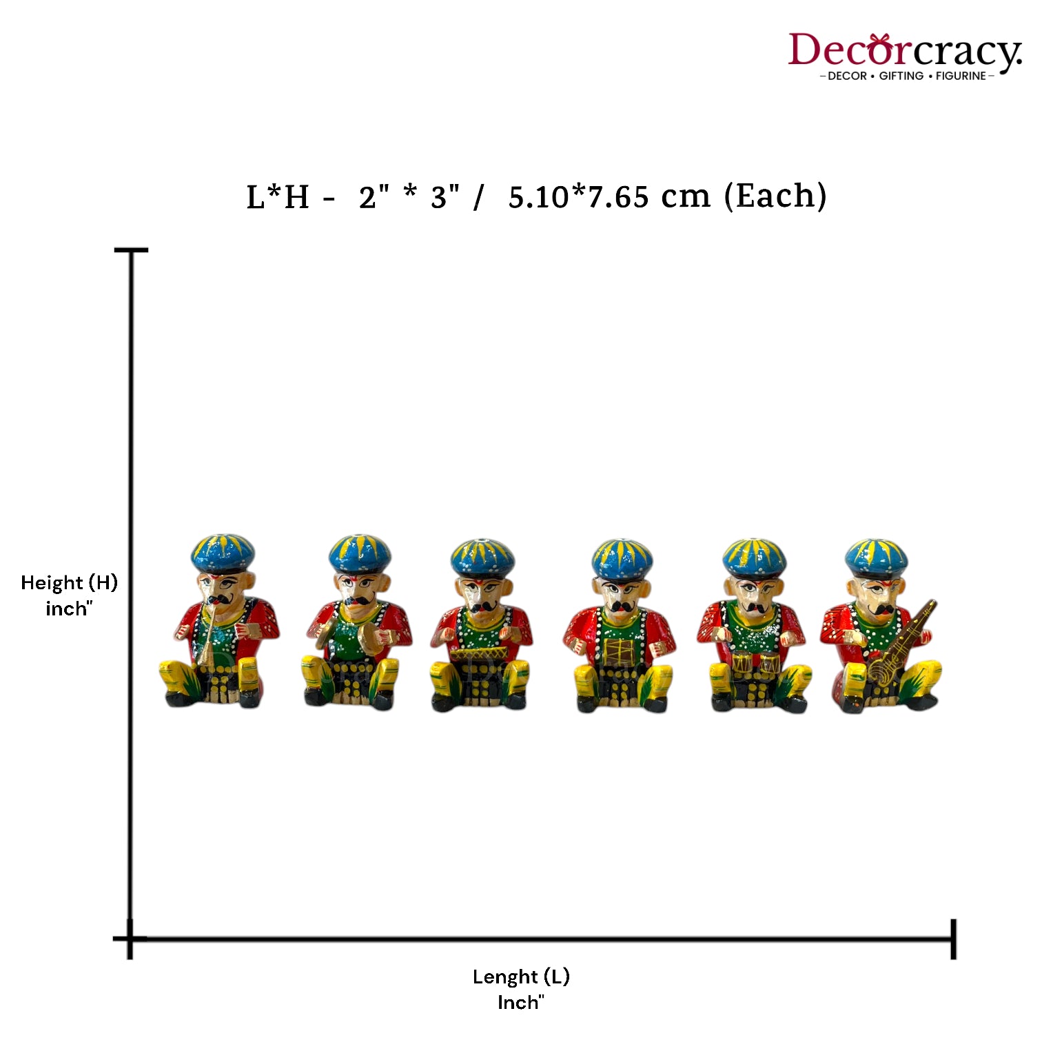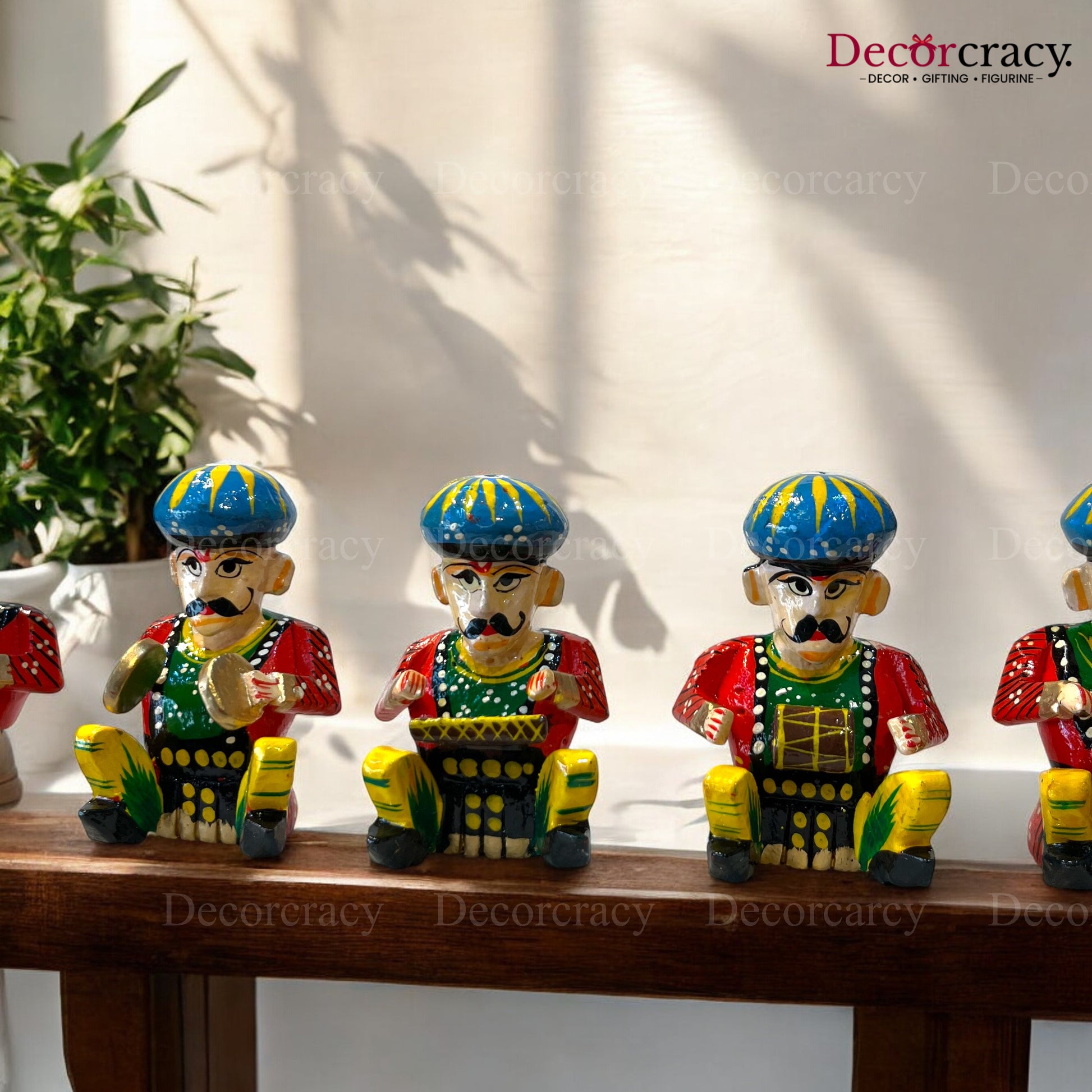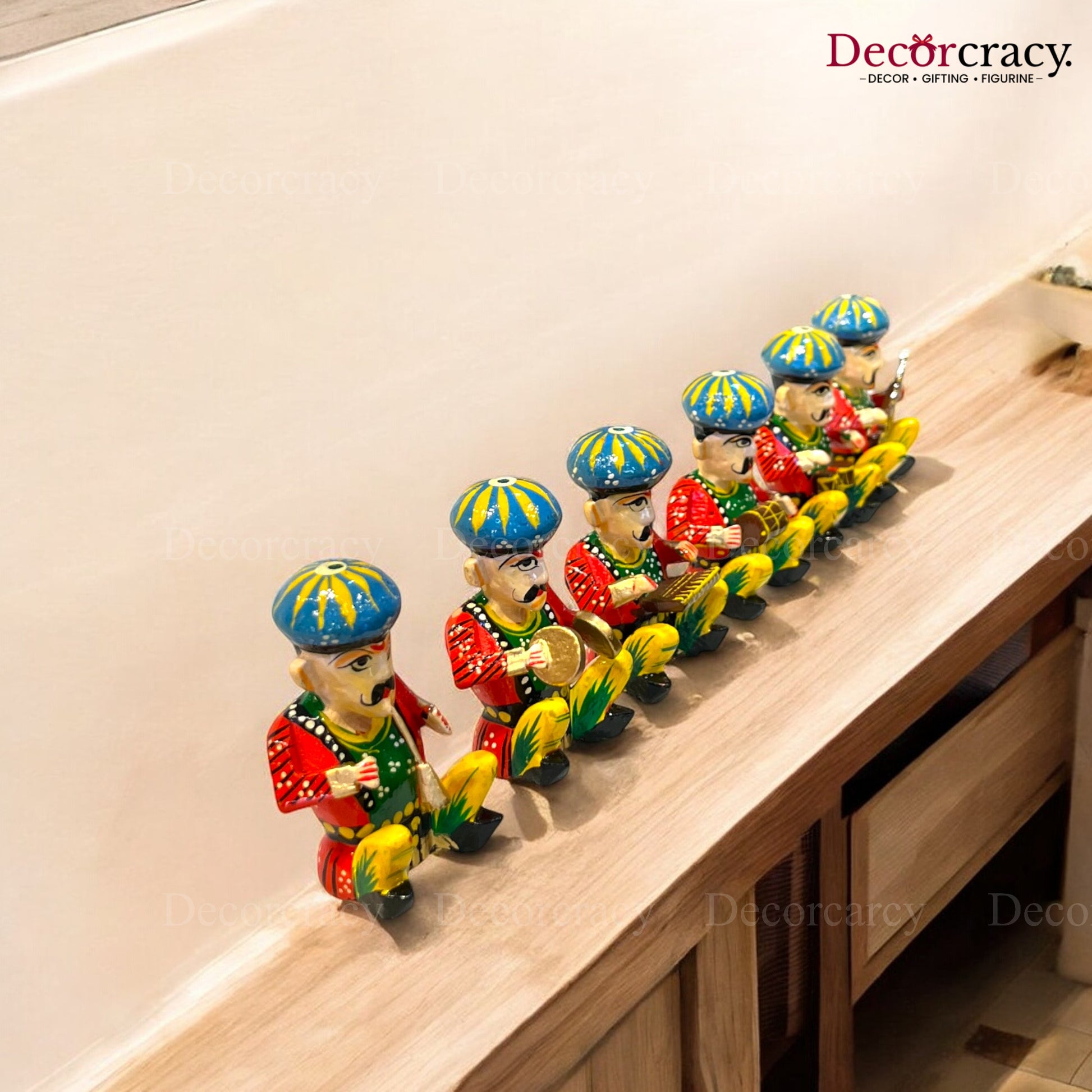This set of hand-painted wooden Rajasthani musician bawla instruments is crafted from wood and painted in vibrant colors, reflecting the rich traditional art of Rajasthan. Their unique design and functionality make them standout decorative pieces for your home. Perfect for housewarming, homecoming, or inauguration gifts.