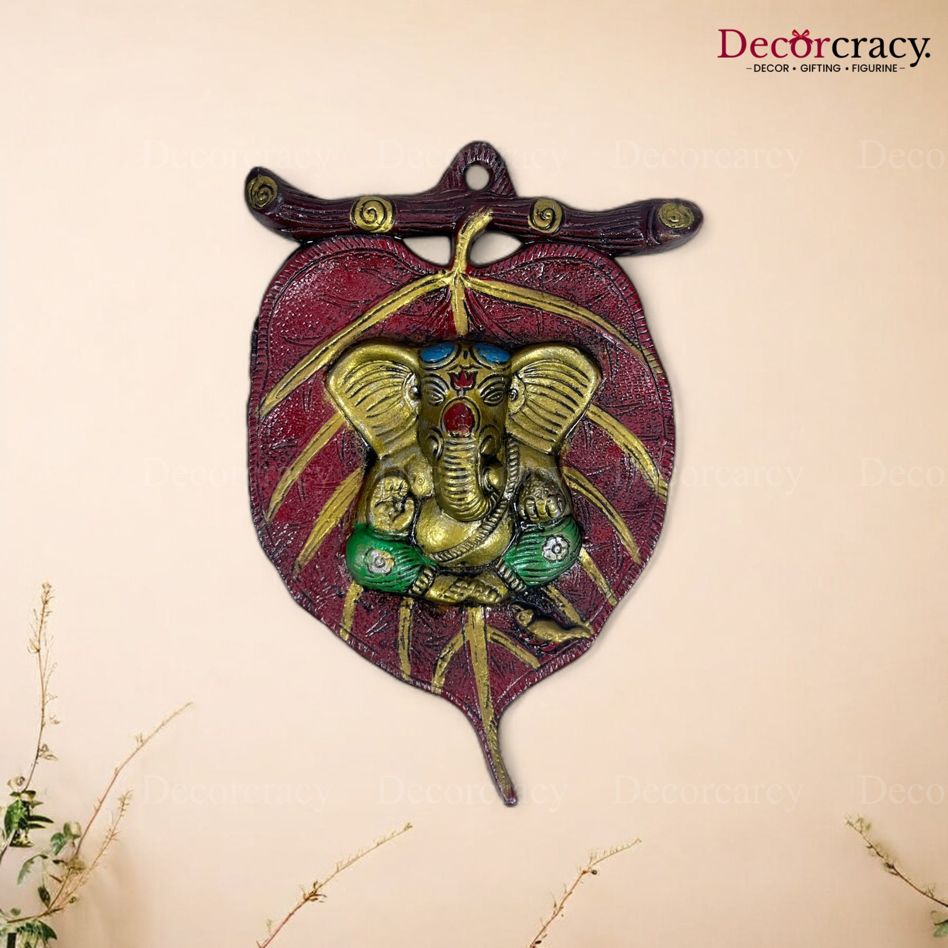 A red leaf-shaped MultiColour wall hanging featuring Lord Ganesha, an auspicious piece that brings prosperity, success, and peace to your space.