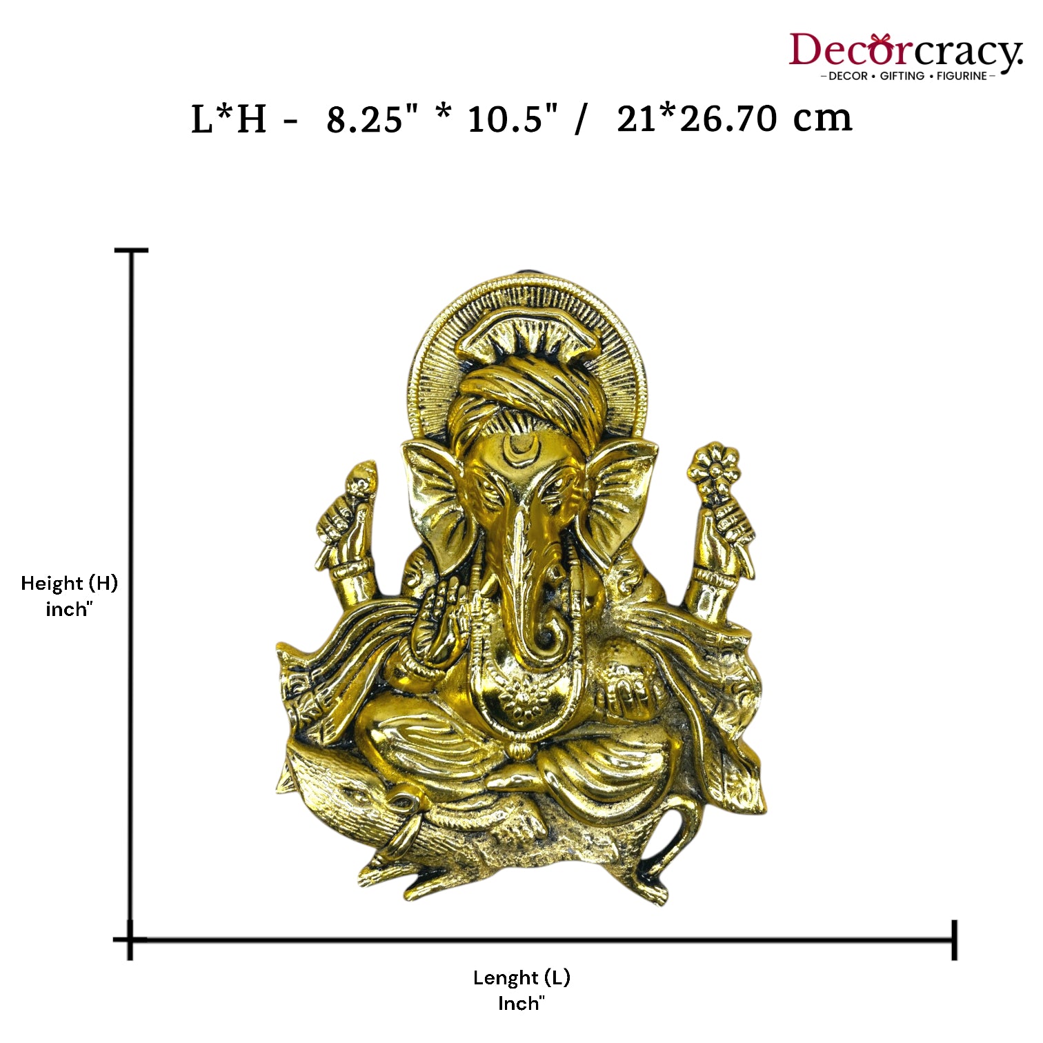 A golden metal wall hanging of Lord Ganesh with his Mushak (mouse) companion, symbolizing wisdom and removal of obstacles.