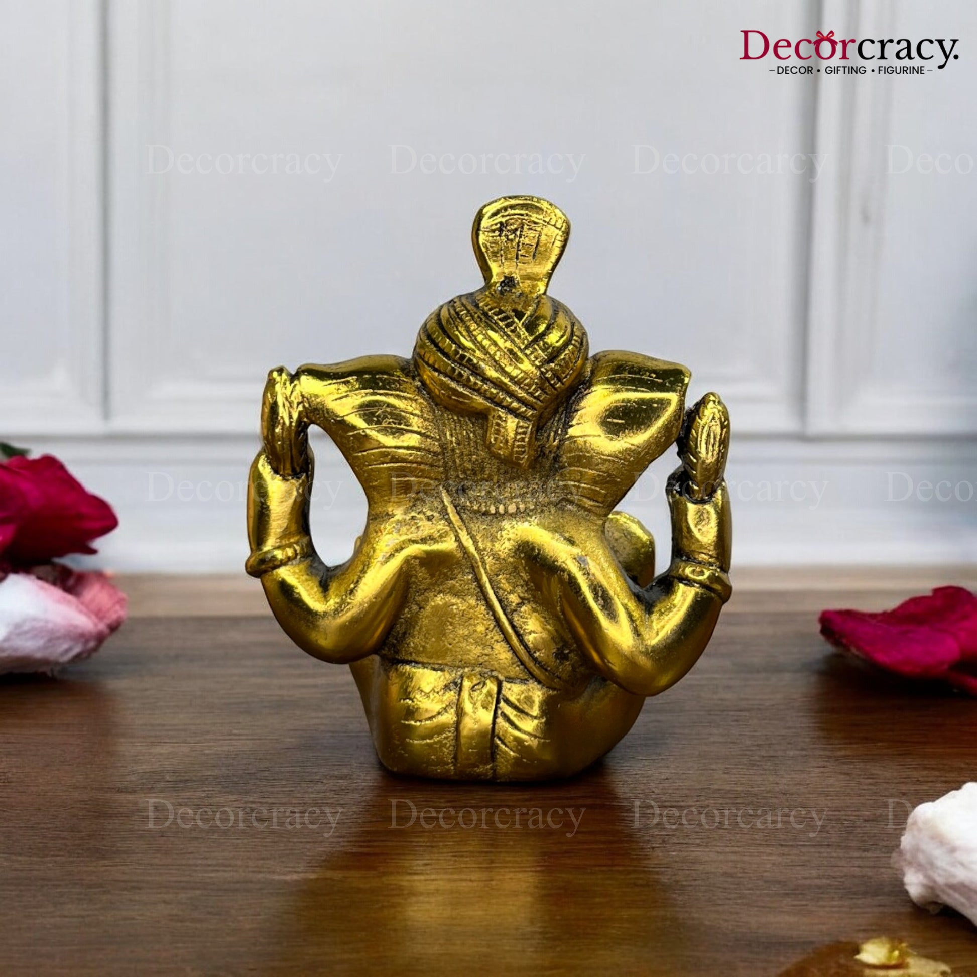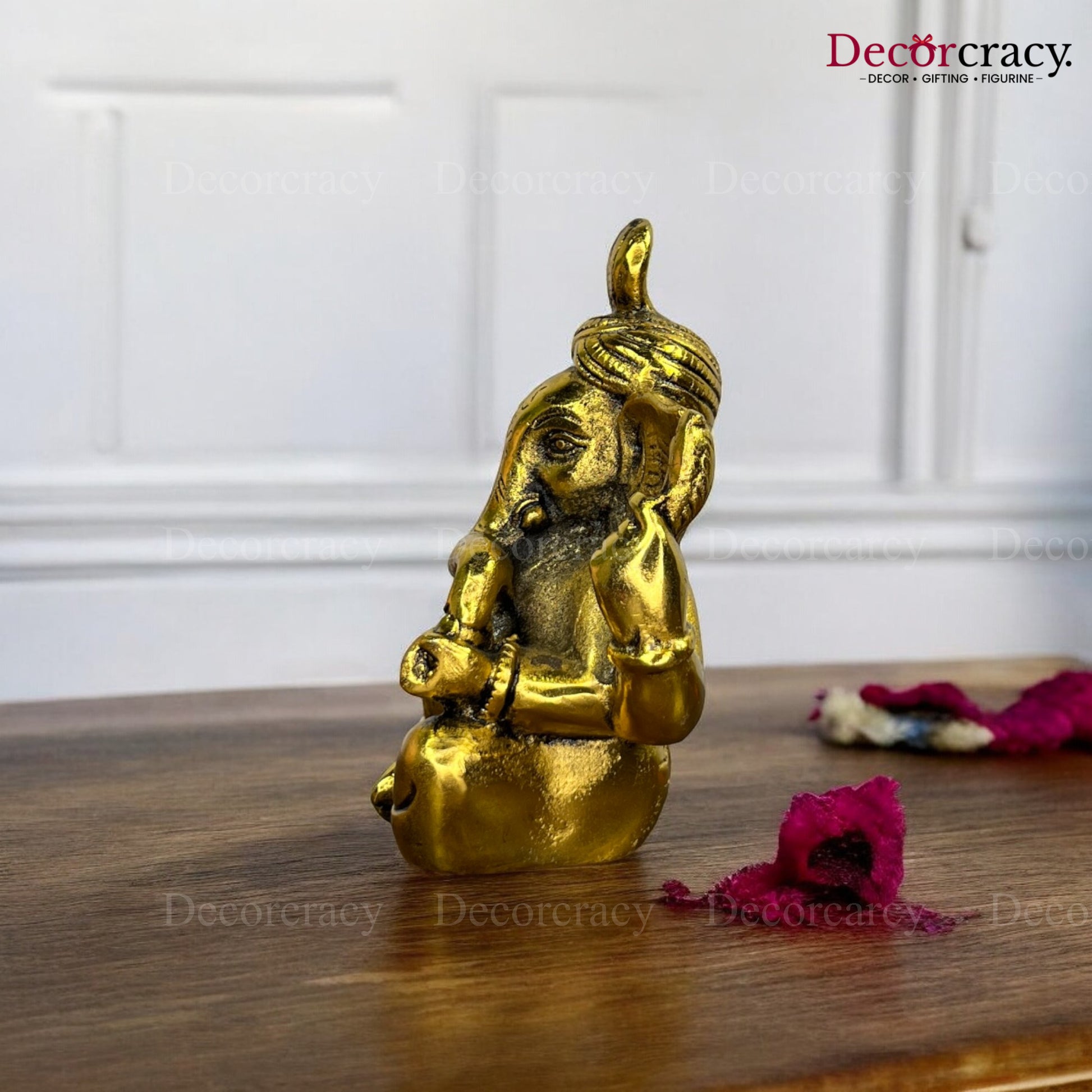 This smaller Ganesh idol with a pagdi (turban) is a beautiful representation of Lord Ganesh, symbolizing wisdom and success. The golden metal finish adds an elegant touch, making it a great addition to any pooja room or altar. Ideal for gifting during auspicious occasions like housewarmings, inaugurations, or Diwali, this idol is a powerful symbol of blessings and good fortune.