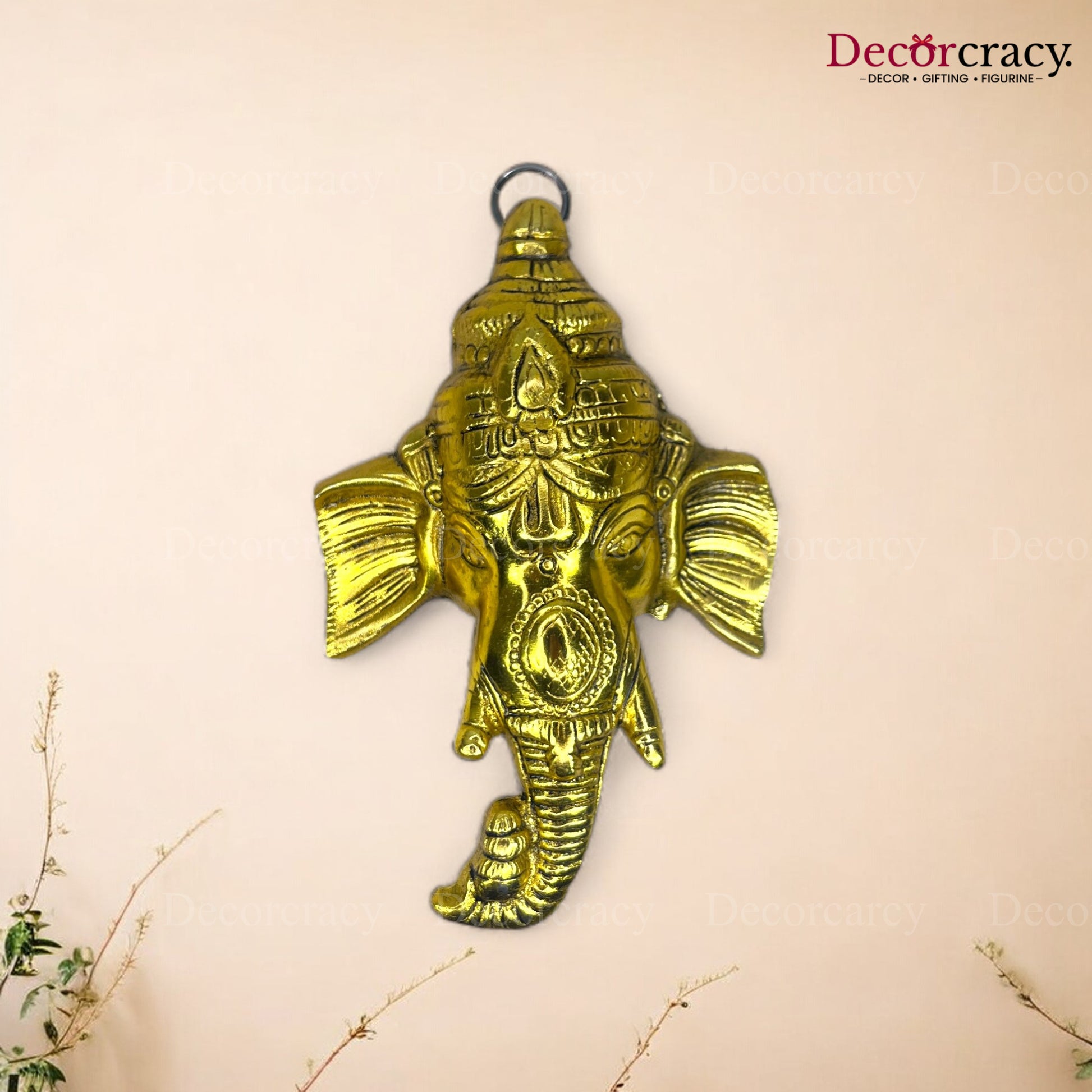 A golden metal wall hanging of Lord Ganesha’s trunk, symbolizing wisdom, success, and the removal of obstacles.