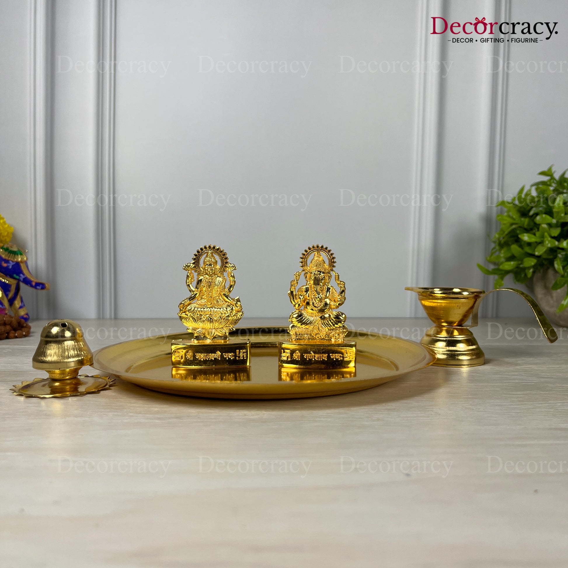 Shree Lakshmi Ganesh Pooja Thali with Diya Deepak Agarbatti Stand Metal Golden SP