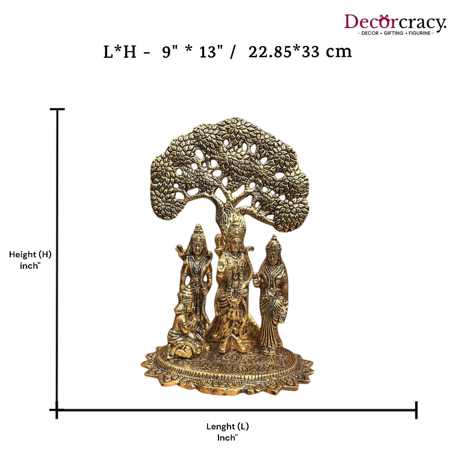 This metal golden sculpture of the Shree Ram Darbar Tree showcases Lord Ram with Sita, Lakshman, Hanuman, and other symbols, set against the backdrop of a tree.