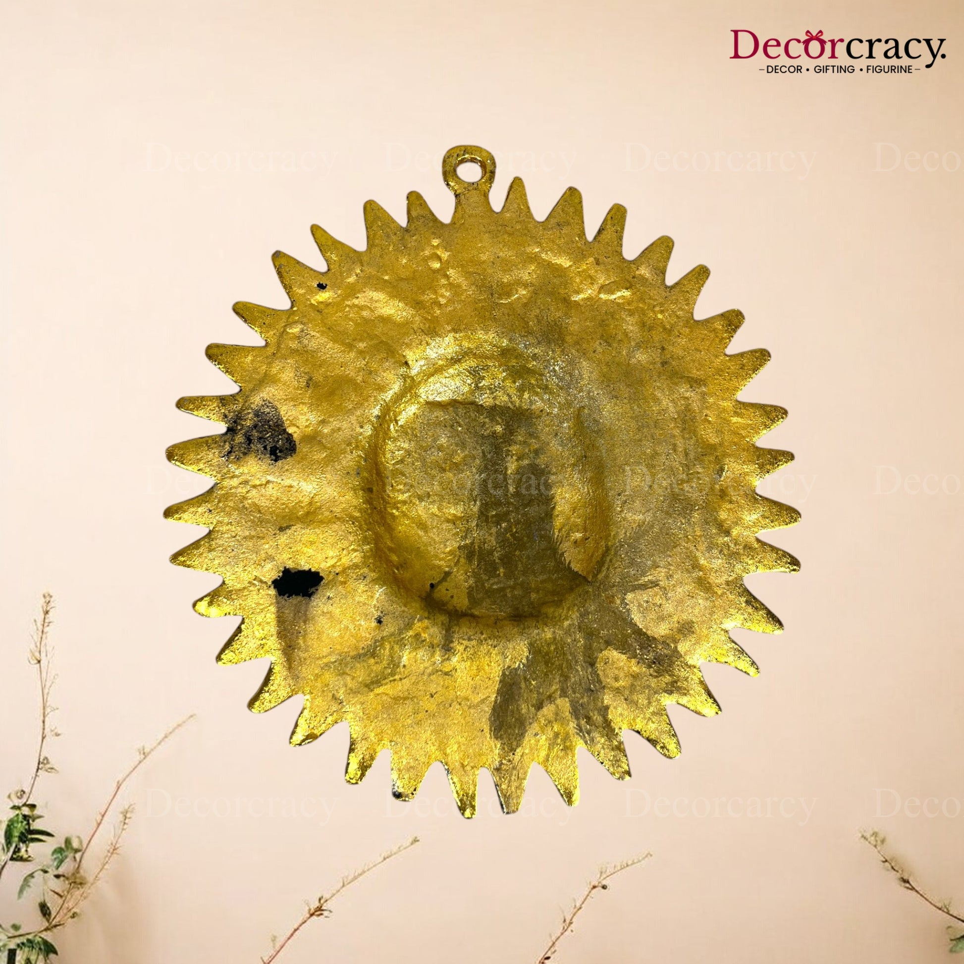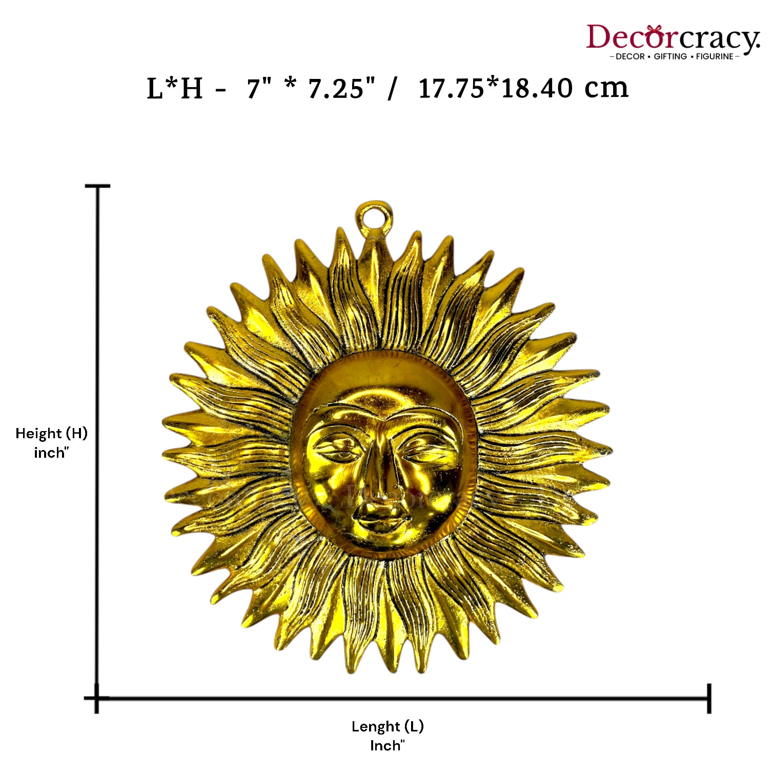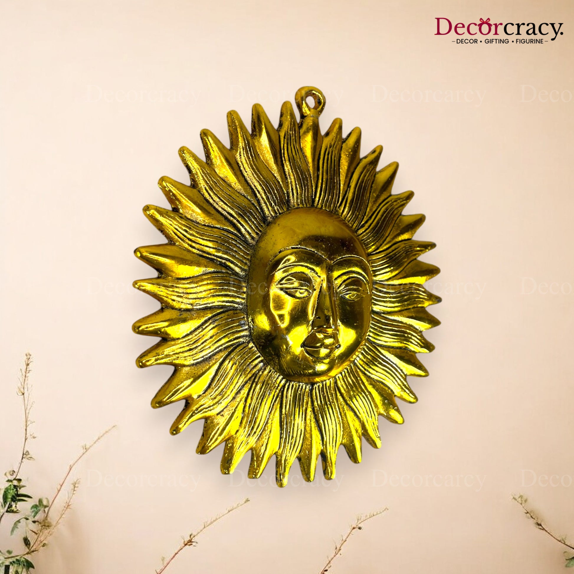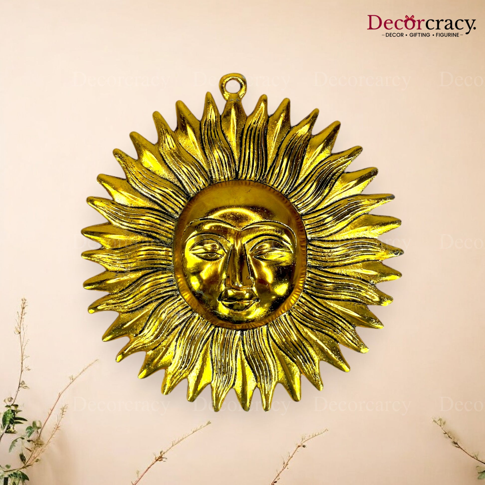 A golden metal wall hanging of the Sun God, Sooraj, representing power, vitality, and energy, ideal for Vastu and spiritual settings.