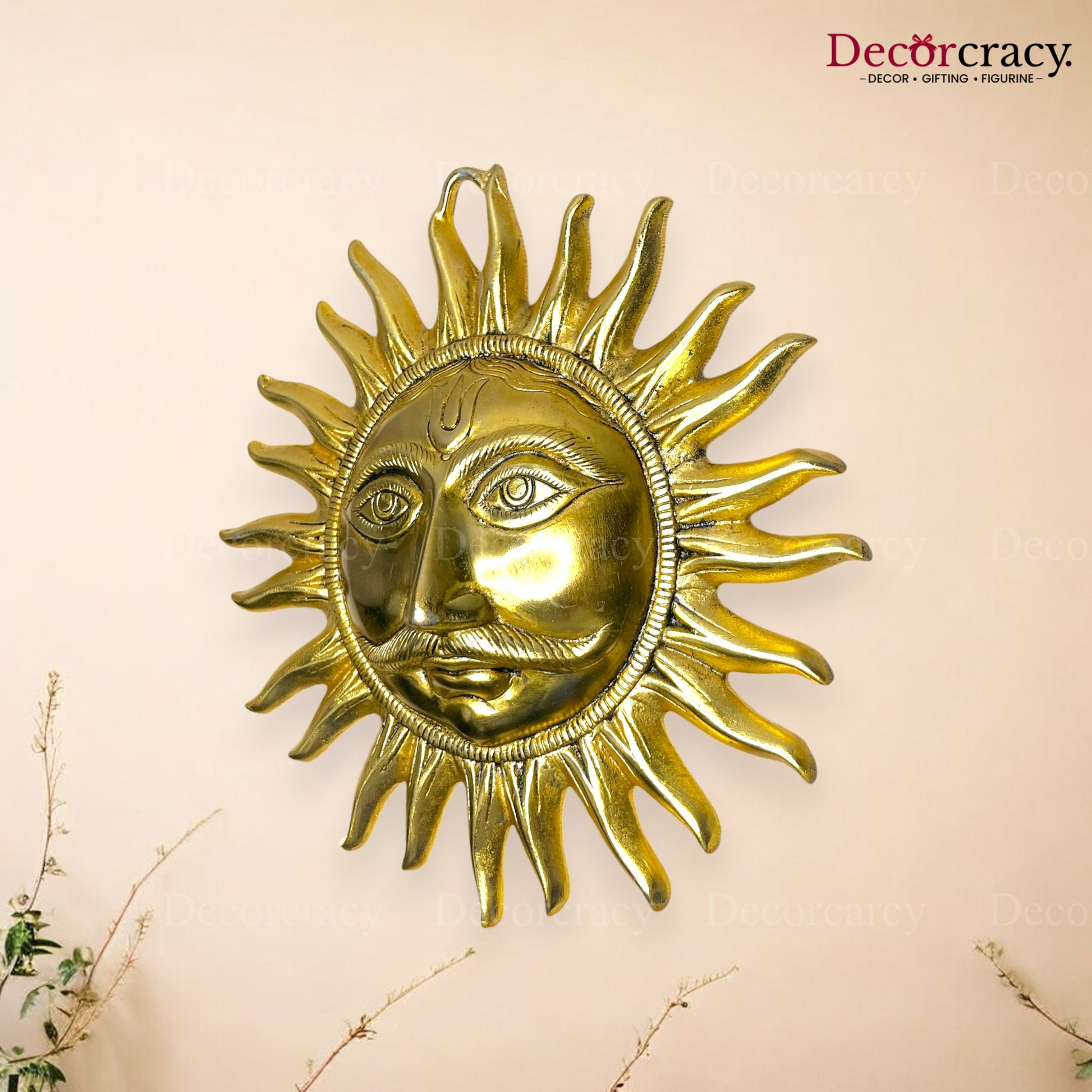 A golden metal wall hanging featuring the face of Sooraj (the Sun God), symbolizing vitality, energy, and prosperity.